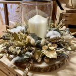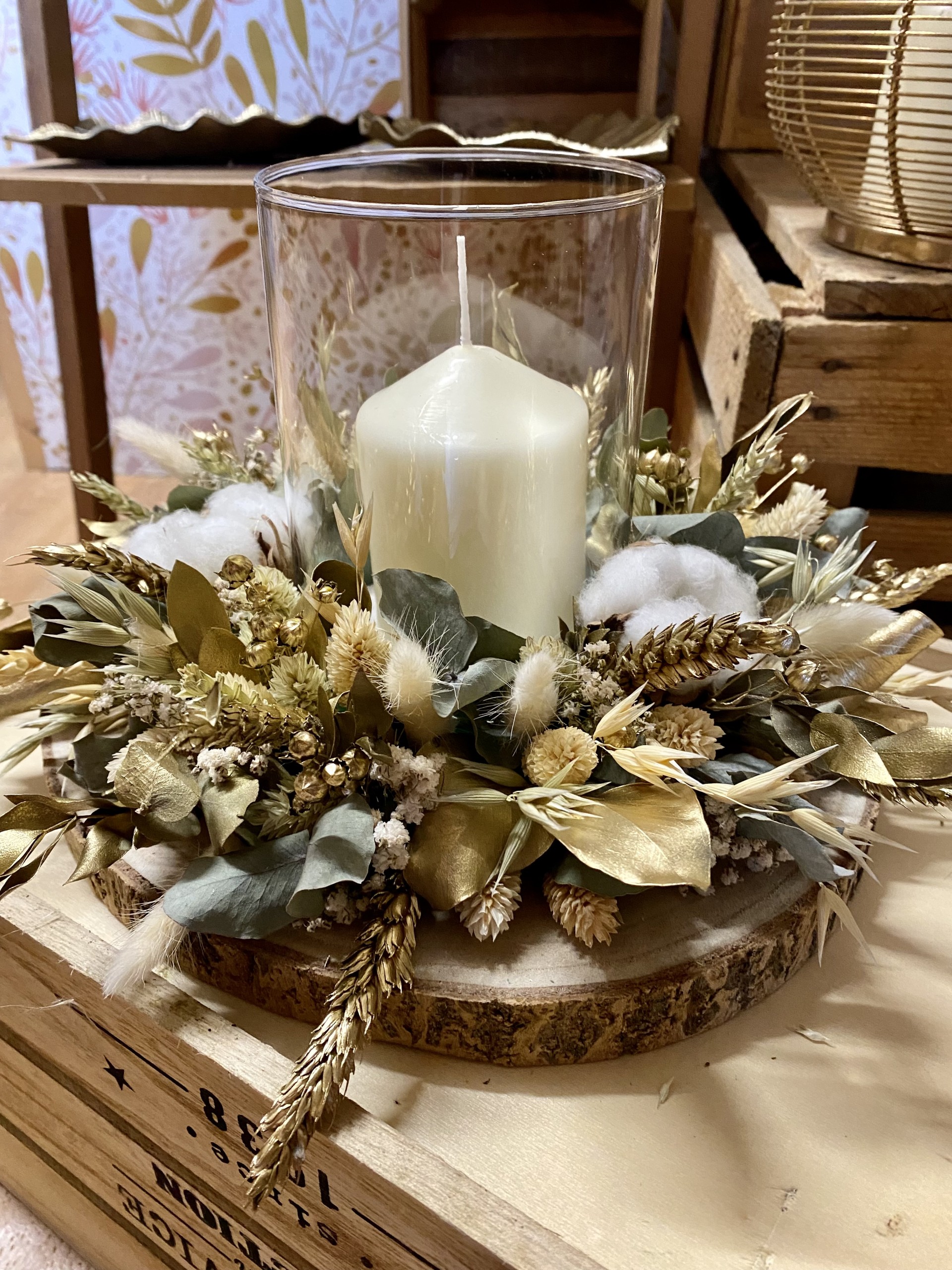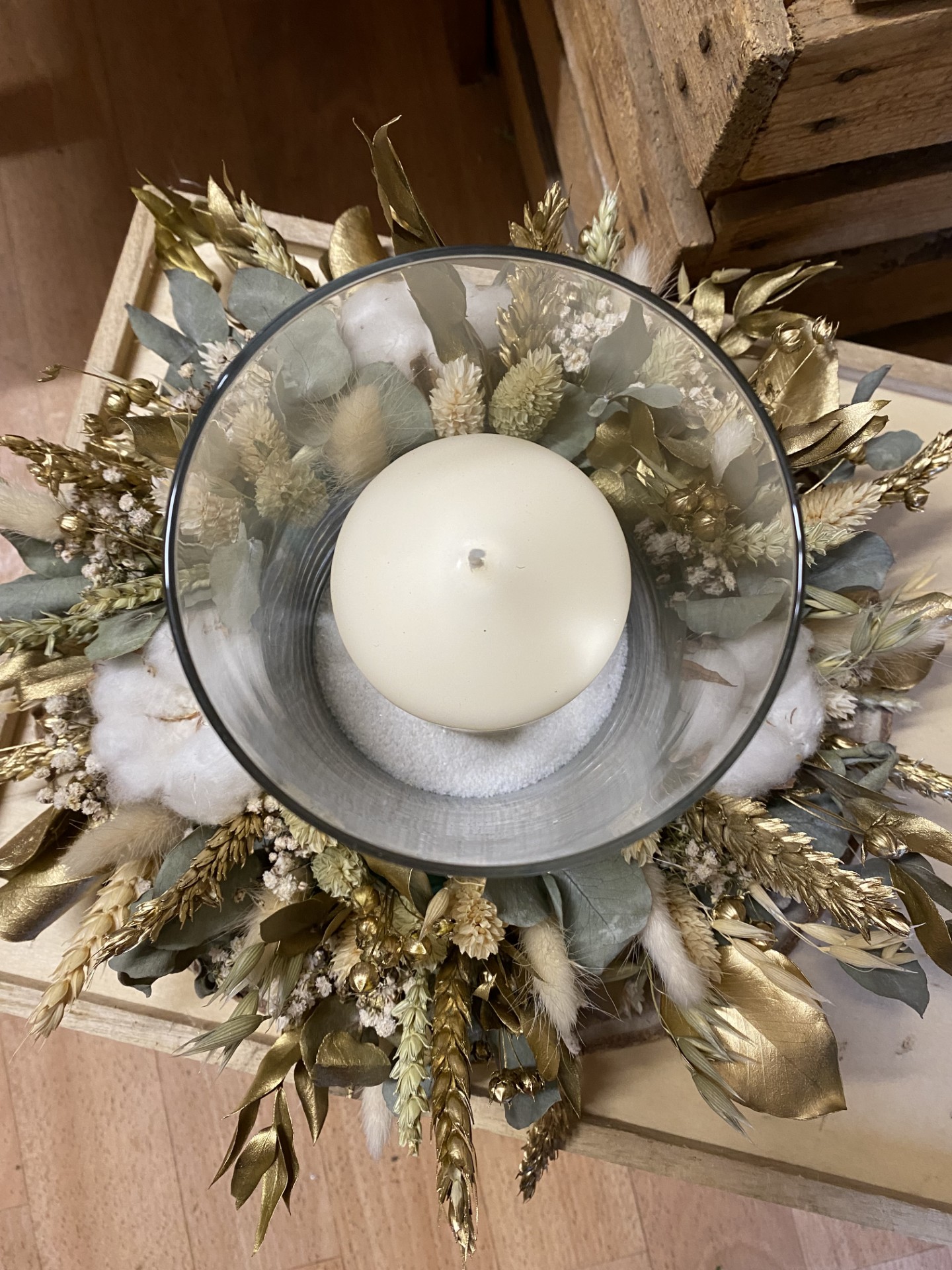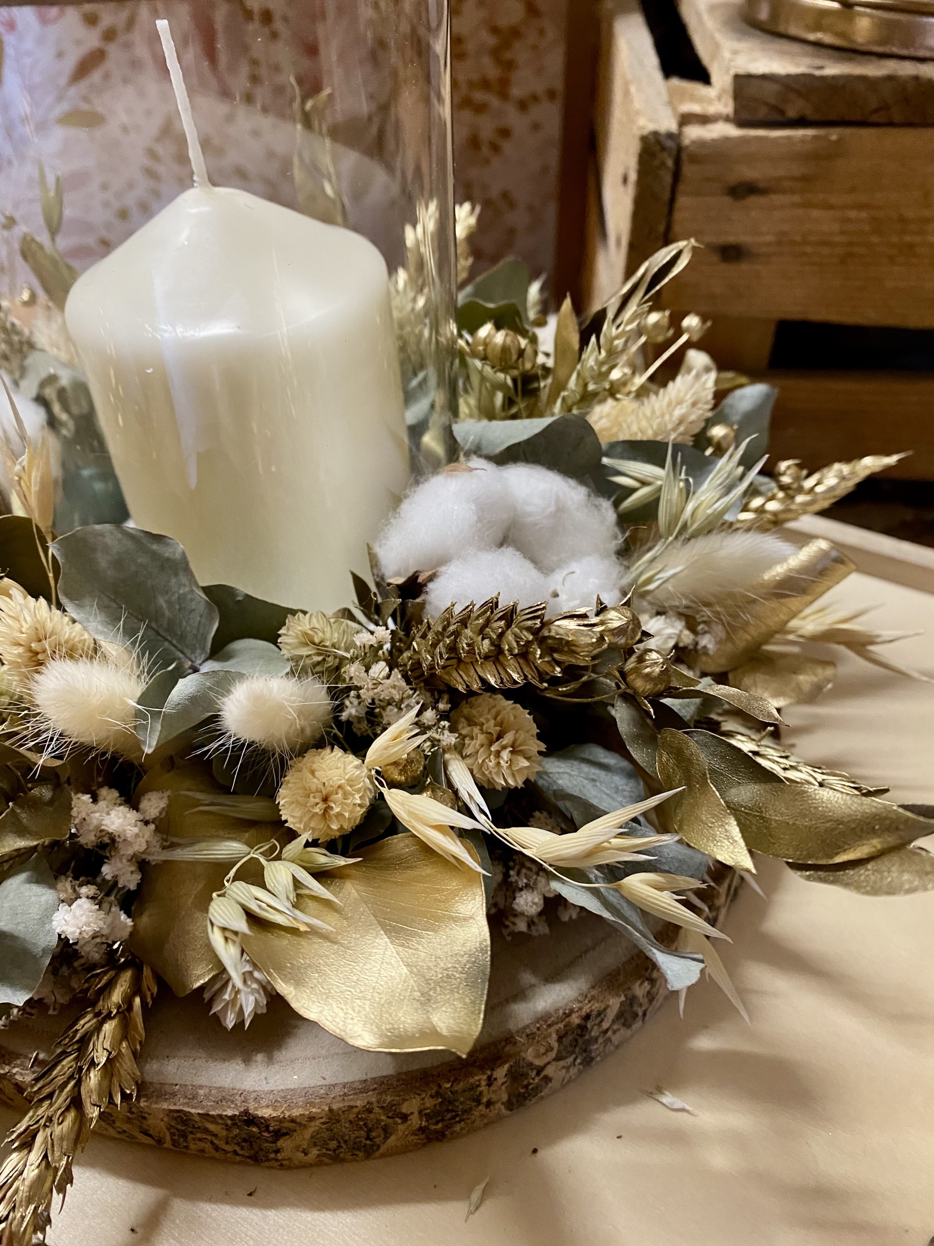 Centre de table avec bougie blanc et doré en fleurs séchées