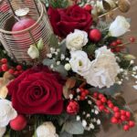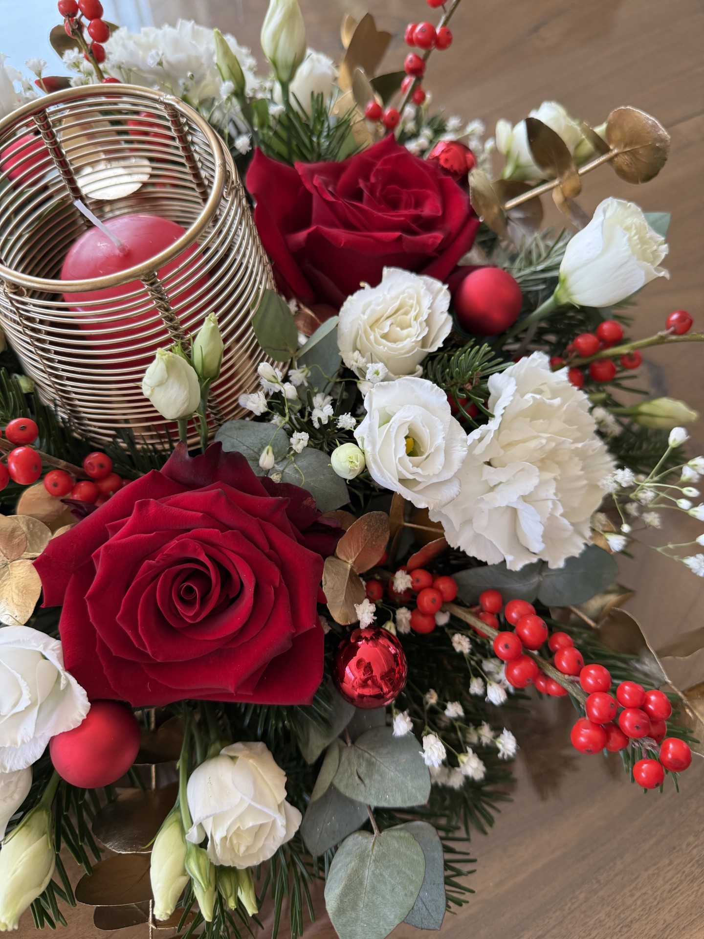 Il est composé de roses, lisianthus, œillets, ilex, gypsophile, eucalyptus, sapin, boules de noël etc…